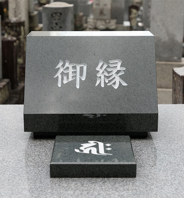 『御縁』と書かれた墓標の下に書かれた梵字は、阿弥陀如来を意味する「キリーク」です。西方極楽浄土に在すのが、阿弥陀如来です。この慈悲に遇えるようにと、刻んでいます。